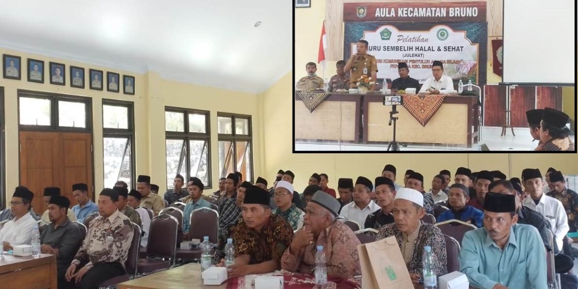 Camat Bruno, Nur Huda, S.STP., M.IP. yang hadir bersama forkopincam turut memberikan sambutannya. “Apresiasi terhadap rekan-rekan penyuluh agama atas terselenggaranya kegiatan Pelatihan Juru Sembelih Halal dan Sehat. Besar harapan, sangat bermanfaat bagi warga Bruno, khususnya bagi para algojo pada Hari Raya Idhul Adha, para kyai, dan takmir,” tuturnya. “Kami beserta seluruh jajaran siap mensupport dan memfasilitasi kegiatan-kegiatan sejenis yang bermanfaat bagi seluruh masyarakat,” lanjut Nur Huda.
