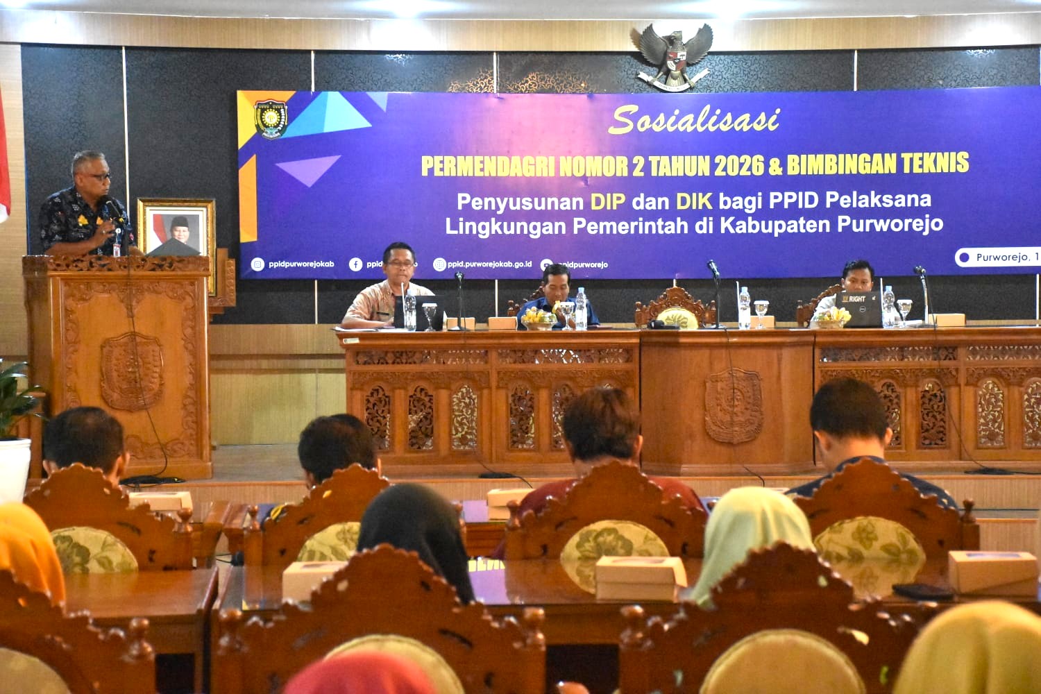 Pemerintah Kabupaten Purworejo melalui Dinas Komunikasi, Informatika, Statistik, dan Persandian (Dinkominfostasandi) menggelar Sosialisasi Peraturan Menteri Dalam Negeri (Permendagri) Nomor 2 Tahun 2026 sekaligus Bimbingan Teknis (Bimtek) Penyusunan Daftar Informasi Publik (DIP) dan Daftar Informasi Dikecualikan (DIK) bagi badan publik di lingkungan Pemerintah Kabupaten Purworejo, Kamis (16/4/2026) di Gedung Arahiwang Setda Kabupaten Purworejo.Kegiatan ini diikuti oleh sekitar 90 peserta yang terdiri dari 41 PPID Pelaksana Organisasi Perangkat Daerah (OPD), 2 Rumah Sakit, 28 PPID Pelaksana Puskesmas dan Labkesda, serta 3 PPID Pelaksana Badan Usaha Milik Daerah (BUMD), dan perwakilan PPID Desa dari setiap kecamatan se-Kabupaten Purworejo.